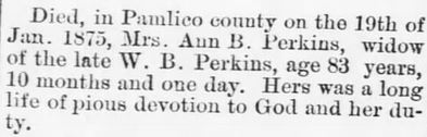 Mrs. Lola Rawls Perdue, 86, of 6015 Newman Davis Road died April 2, 1993, at Wesley Long Community Hospital. Funeral will be at 2 p.m. Sunday in Hanes-Lineberry Vanstory Street Funeral Home. Burial will be in Rehobeth United Methodist Church cemetery. A native of Pamlico County, she was an employee with S&H Kress Co. She attended Concord Friends Meeting. Surviving are daughters, Ruby Morgan of Mebane, Gladys Hunt of Greensboro; sons, Jay Perdue, Horace Perdue, Morris Perdue, and Fred Perdue, all of Greensboro; sisters, Lula Lee of Oriental, Effie Hardison of High Point; 11 grandchildren; 14 great-grandchildren; and one great-great-grandchild. The family will be at the funeral home from 7-9 tonight and other times at the home of a son, Horace Perdue, 4503 Freida Lane, Greensboro. Contributions may be made to Concord Friends Meeting or to Rehobeth United Methodist Church Cemetery Fund. (Greensboro News & Record [Greensboro, NC] - April 3, 1993; pg. B6)