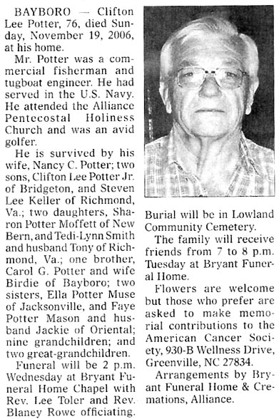VANDEMERE - William "Bill" O. Potter, Jr., 74, of Vandemere died Saturday, September 18 at Craven Regional Medical Center. A funeral service is scheduled for Tuesday, September 20 at 3 pm at Vandemere United Methodist Church with the Rev. Mike Roach officiating, with burial in Celestial Memorial Gardens. He is survived by his widow, Marena Potter; two sons, William Bryan Potter and Jason Page Potter of Chocowinity; one daughter, Marena Wendy Potter Hayes of the home. Arrangements by Bryant Funeral Home and Cremations, Alliance, NC. (The Pamlico News [Oriental, NC] - September 20, 2005)