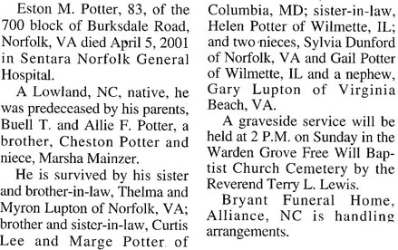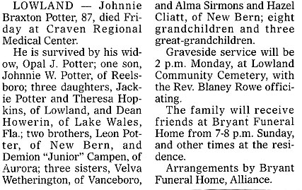 LOWLAND - Siddie Golden Potter, 95, died Thursday, September 29 at Craven Regional Medical Center. A funeral service was held Saturday, October 1 at 3 pm at Bryant Funeral Home Chapel with the Rev. Kenneth Windham officiating. Burial was in Lowland Community Cemetery. She was a member of Grace Primitive Baptist Church. She is survived by two sons, Clifton Potter and Carol Potter, both of Bayboro; two daughters, Ella Muse of Jacksonville and Faye mason of Oriental; 13 grandchildren; 22 great-grandchildren; and six great-great-grandchildren. Arrangements by Bryant Funeral Home and Cremations, Alliance. (The Pamlico News [Oriental, NC] - October 2005)