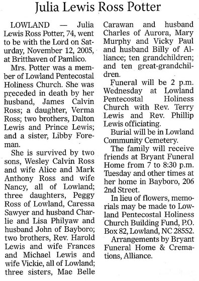 LOWLAND - Opal Anetta Johnson Potter, 91, died Sunday, April 18, 2010, at CarolinaEast Medical Center. She was a member of Wardens Grove Free Will Baptist Church. She is survived by one son, Johnnie Wayne Potter and wife, Wendy, of Reelsboro; two daughters, Jackie Potter and husband Jeff, and Theresa Potter Hopkins and husband Tommy, all of Lowland; one stepdaughter, Dean Howerin and husband, O.B., of Grantsboro; one brother, Carl Wayne Johnson of Greensboro; eight grandchildren, Kristin Hopkins, Brandon Hopkins, Kimberly Hopkins, Vicki Lewis, Jon Potter, Carolyne Potter, Sarah Weinhold and Rebecca Robison; and five great-grandchildren, Dustin Murray, Kierstin Murray, Caleb Hopkins, Tyler Hopkins and William Weinhold. A graveside service will be held at 2 p.m., Wednesday, April 21, at Lowland Community Cemetery with the Rev. Earl Sadler Jr. and the Rev. Saundra Johnson officiating. The family will receive friends from 6:30 to 8 p.m. Tuesday, at Bryant Funeral Home. Arrangements are by Bryant Funeral Home & Cremations, Alliance. (Sun-Journal [New Bern, NC] – Wednesday, April 21, 2010)Peggy Ross Bennett Potter
