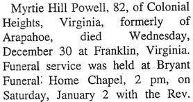 Marie Green Powell, 91, born to James & Rosa Banks, went to be with her Lord, Monday, at her home. She was a loving mother and grandmother. She was a charter member of Goose Creek P.H. Church. She is survived by her husband of 42 years, Walter; children, James (Doris) Green, Sarah (Charles) Hardison, and Jeff (Kelly) Green; daughter-in-law, Joanne Green; stepchildren, David (Kathy) Powell and Dillan Bryan; three brothers, three sisters; 15 grandchildren; 25 great-grandchildren; and six great-great grandchildren. She was preceded in death by her first husband of 32 years, Lenwood Green and son, Lonnie Green; four brothers and five sisters. Her funeral will be held 2:00 p.m., Thursday, August 22 at the Reelsboro Pentecostal Holiness Church with the Rev. Alan Woodard and the Rev. Cindy Midyette officiating. Interment will be in Green-Banks Cemetery. The family will receive friends and relatives one hour prior to the service at the church. (Bryant Funeral Home)Myrtie Hill Powell