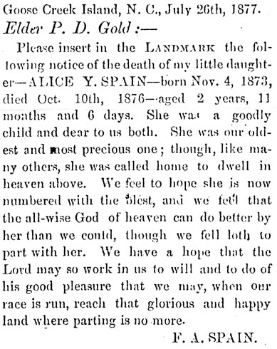 (Zion's Landmark, Vol. X, No. 20, dated Sept 1, 1877, Wilson, NC)Evelyn Gaskill Spain