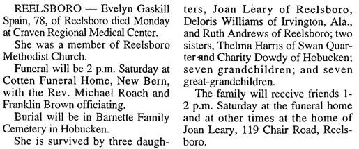 Joeanna Hopkins Spain, 101, of Hobucken died Sunday, Jan. 1 at Britthaven of Pamlico. She was a member of Hobucken United Methodist Church. Funeral service will be 11 a.m. Wednesday, Jan. 4 at Bryant Funeral Home Chapel, with the Rev. Lee Toler officiating. Burial will be in Barnett Cemetery in Hobucken. She is survived by a son, Ernest Spain of Chesapeake, Va.; a daughter, Nellie S. Hopkins of Hobucken; a sister, Lillian Sadler of Hobucken; three grandchildren, four great-grandchildren; and numerous great-great grandchildren. The family will receive friends following the service at Bryant Funeral Home. Arrangements by Bryant Funeral Home and Cremations, Alliance. (Sun Journal [New Bern, NC] - Monday, January 2, 2012)Robert Earl Spain