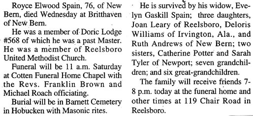 Robert Earl Spain, 52, of Reelsboro passed away Friday, December 12, 2014 at Crystal Coast Hospice House. He was employed with Humphrey Mechanical in Jacksonville. He was preceded in death by his father, William Earl Spain. He is survived by his mother, Joyce Spain of Scott Depot, West Virginia; two sisters, Edna Ireland and husband, Tom, of Reelsboro and Mary Ballenger and husband, Mike, of Midlothien, Virginia; and one niece, Cheyenne. His memorial service will be held at 11 a.m., Saturday, December 20th at Bryant Funeral Home Chapel with the Rev. Mike Scott and the Dr. Robert Cayton officiating. The family will receive friends immediately following the service. Arrangements by Bryant Funeral Home & Crematory, Alliance. (The Pamlico News [Oriental, NC] - December 17, 2014)Royce Elwood Spain