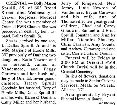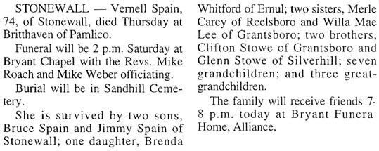GRANTSBORO - Gladys Mayo Spain, 74, died Tuesday, May 17 at Craven Regional Medical Center. A graveside service was held Thursday, May 19, 3 pm in the Barnett Cemetery in Hobucken with the Rev. Mike Roach officiating. She is survived by one daughter, Donna Walker of Arapahoe; one brother, James Mayo of Alliance; one sister, Ola Lewis of Hobucken; and two grandchildren. Arrangements by Bryant Funeral Home & Cremations, Alliance. (The Pamlico News [Oriental, NC] - May 2005)