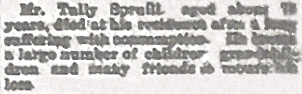 Mr. Tully Spruill, aged about 76 years, died at his residence after a long suffering with consumption. He leaves a large number of children, grandchildren and many friends to mourn his loss. Submitted by Judy Nobles Lewis who states "Tully Spruill was born in 1811 in Tyrrell County and died in 1886 in Pamlico County. He was my great great great grandfather through his son Albert who died in Craven County." Bobbie Earl Squires