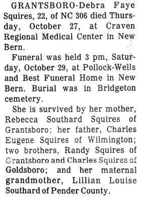HOBUCKEN - James L. Swindell, 30, of Hobucken died Wednesday. Graveside service will be 2 p.m. Saturday at Barnett Cemetery with the Rev. Jeff Bartley officiating. He is survived by two brothers. Keith Swindell of McClellanville, SC and Bobby Swindell of Hobucken; two sisters, Anita Mayo of Bayboro and Delores Swindell of Hobucken; his parents Mr. & Mrs. Leadrew Swindell of Hobucken, his paternal grandparents, Mr. & Mrs. Jimmy Swindell of Hobucken. The family will receive friends at their home in Hobucken. (unknown newspaper & date) [Kindly submitted by Jan Orndorff who gave the following information: James Leadrew Swindell, born 20 Jul 1953, Hobucken, Pamlico Co., NC; died 20 Jul 1983; son of James Leadrew Swindell & Geraldine Walker]