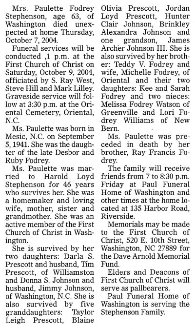 ORIENTAL - Edith Helen White Stephens, 95, died Sunday, Oct. 21, 2007, at Two Rivers Campus in New Bern. She had been a cook at Pamlico County Schools. She was preceded in death by her husband, Henry A. "Jim" Stephens; a daughter, LaFoy S. Pickles; and a son, Henry H. Stephens. She is survived by four grandchildren, Steve Pickles of Pine Bluff, Ariz., Trudy P. Cleere of Bayboro, Henry Stephens of Newark, N.Y. and Doris Waddell of Newark, N.Y.; great-grandchildren, Stephanie P. Williams, Robby Cleere, Sara Cleere, Rachel Cleere, Merrill Stephens, Cara Stephens, Steve Kepner and Misty Neilson; and two great-great-grandchildren, Blake Neilson and Jolia Neilson. A graveside service will be held at 2:30 p.m. Wednesday, Oct. 24, in the Oriental Cemetery with the Rev. Richard Baldwin officiating. The family will receive friends at the home of her granddaughter, Trudy Cleere, 302 South Street, Bayboro. Arrangements by Bryant Funeral Home and Cremations, Alliance. (Sun Journal [New Bern, NC] - Tuesday, October 23, 2007)Paulette Fodrey