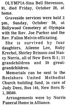 HOBUCKEN – Rosa Lupton Swindell died Friday at her residence. Funeral is set for 2 p.m. Saturday, at Hobucken Pentecostal Holliness Church with the Rev. W. H. Lewis and the Rev. Henry Carroll officiating. Burial will be in Barnett Cemetery. She is survived by two sons, Leadrew Swindell, Jimmie “Nook” Swindell, both of Hobucken; four daughters, Sally Jane Brown, the Rev. Magdalene Jones and Abby Leary, all of Hobucken and Josephine Pate of Bayboro; one brother, Fenner Lupton of Hobucken; sisters, Rena Evans of Bayboro, Odessa Ford of New Bern, Millie Hopkins of Greensboro, Elizabeth Lupton of Lowland, Veroma Swindell of New Bern and Missouri Gaskill of Hobucken; 21 grandchildren; 30 great-grandchildren and one great-great-grandchild. The family will receive friends between 7 and 8:30 tonight at Norris Funeral home, Alliance. (unknown newspaper & date) [Kindly submitted by Jan Orndorff who gave the following information: Rosa Lillian Lupton Swindell, born 12 Sep 1908, Hobucken, Pamlico Co., NC; died 26 Jun 1987, Hobucken, Pamlico Co., NC; wife of James Farnell Swindell]