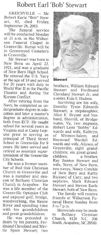 Ruben Earl Stapleford, 82, born June 25, 1926, in Oriental, passed away on October 4, 2008, in Norfolk, Va. He is survived by his sister, Golda Stapleford Bell, and extended family members throughout the mid-Atlantic region. He is preceded in death by his parents, Thomas Hazel Stapleford and Vera Brown Stapleford, and his siblings, Kemp Francis Stapleford, Elizabeth Stapleford Mann, Hazel Calvine Stapleford Jones and Vera Geraldine Stapleford Kijewski. Ruben was raised in Oriental, served in the U.S. Air Force from 1944 to 1968 and was a veteran of WWII and the Vietnam War. Upon retiring from the Air Force he entered the U.S. Merchant Marines and continued to serve his country. He was a devout man who lived a simple life. He loved his family, church, music, reading, birds and sailing the seas. While his roots and love for his Oriental home were forever in his heart, Ruben lived in Norfolk, Va., with family and friends who shared his love of life. The Reverend Paul Grubbs of Oriental Free Will Baptist Church will preside over a graveside service in the Oriental cemetery to be held at 11 a.m. on Saturday, October 11, 2008, followed by a Celebration of Life luncheon in the church's Fellowship Hall from noon until 3 p.m. for family and friends. Arrangements by Bryant Funeral Home and Cremations, Alliance. (Sun Journal [New Bern, NC] – Wednesday, October 8, 2008)