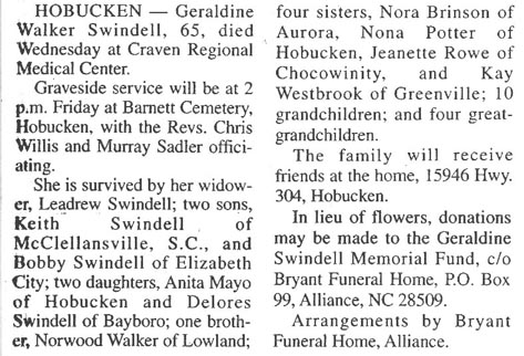 HOBUCKEN - Jimmy "Nook" Swindell, Jr., 59, of Hobucken died Monday, July 23, at Carteret General Hospital. Graveside service will be held Thursday, July 25, 10 a.m. at Barnett Cemetery with the Rev. Jerry Edge officiating. He is survived by three daughters, Connie S. Stephens of Jacksonville, Mitzi S. Temple of New Bern, and Leighan Swindell of the home; four sisters, Sally Brown, Magdalene Jones, all of Hobucken; and Sheen Rea of Alliance; one brother, Leadrew Swindell of Hobucken; and four grandchildren. The family will receive friends at Norris-Bryant Funeral Home in Alliance from 7 pm to 8 p.m. and other times at the home in Hobucken. Memorial donations may be made to the N.C. Fisheries Association Auxiliary, Pamlico County Chapter, Hobucken, NC 28537. Arrangements by Norris-Bryant Funeral Home. (The Pamlico News - July 24, 1996) [Both obituaries kindly submitted by Jan Orndorff who gave the following information: James Farnell "Jimmy Nook" Swindell, Jr., born 18 Nov 1936, Hobucken, Pamlico Co., NC; died 22 July 1996, son of James Farnell Swindell & Rosa Lillian Lupton]