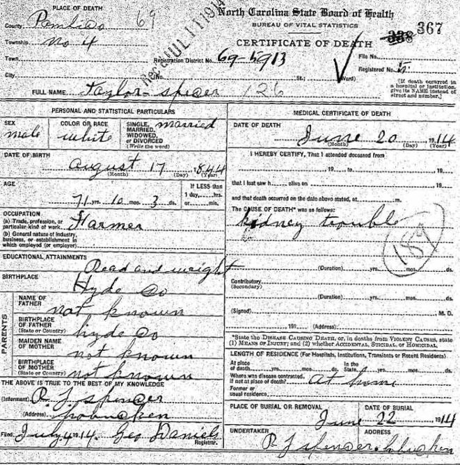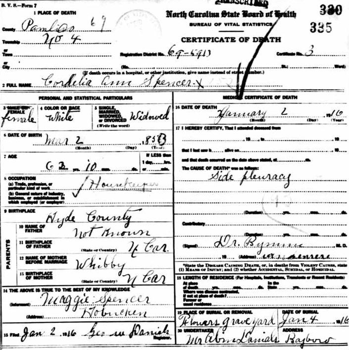 Zachariah's 2nd marriage was to Cordelia Ann Rollinson in Hyde Co., NC on May 15, 1873. Cordelia, daughter of Robert R. Rollinson & Dinah Whidbee, was born Mar. 2, 1853 in Frisco, NC and died Jan. 2, 1916 [see death certificate]. She is also buried in the Flowers Cemetery. In 1880 Z.T. & Cordelia were living in the Hatteras Twp. of Dare Co., NC where they were raising their 3 daughters, Mary Ann, Lodena, & Louisa. Between 1880-1900 they had moved into Twp. #4 of Pamlico County. The 1900 census states that this couple had 8 children but only 7 were living. Above photo submitted by Jan Orndorff as part of the William Odell Spain Collection. |