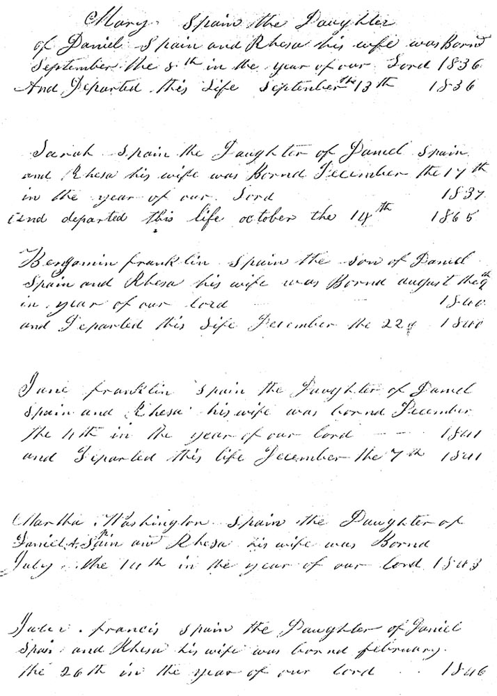 September the 13th 1836 Sarah Spain the Daughter of Daniel Spain and Rhesa his wife was Bornd December the 17th in the year of our Lord 1837 and departed this life October the 14th 1865 Benjamin franklin Spain the Son of Daniel Spain and Rhesa his wife was Bornd August the 9th in the year of our lord 1840 and Departed this Life December the 22d 1840 Jane franklin Spain the Daughter of Daniel Spain and Rhesa his wife was bornd December the 4th in the year of our lord 1841 and Departed this life December the 7th 1841 Martha Washington Spain the Daughter of Daniel A. Spain and Rhesa his wife was Bornd July the 14th in the year of our lord 1843 Julia francis Spain the Daughter of Daniel Spain and Rhesa his wife was bornd february the 26th in the year of our lord 1846 |