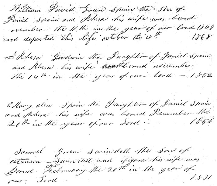 this life october the 4th 1868 Rhesa Goodwin the Daughter of Daniel Spain and Rhesa his wife was bornd november the 14th in the year of our lord 1852 Mary Alen Spain the Daughter of Daniel Spain and Rhesa his wife was bornd December the 20th in the year of our Lord 1856 Samuel Green Swindell the Son of Alanson [Allison] Swindell and efigane? [Effie Jane?] his wife was Bornd February the 20th in the year of our Lord 1831 |