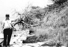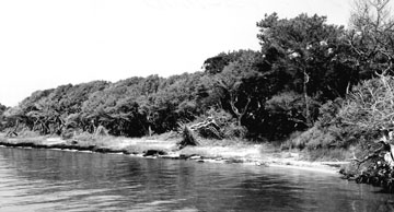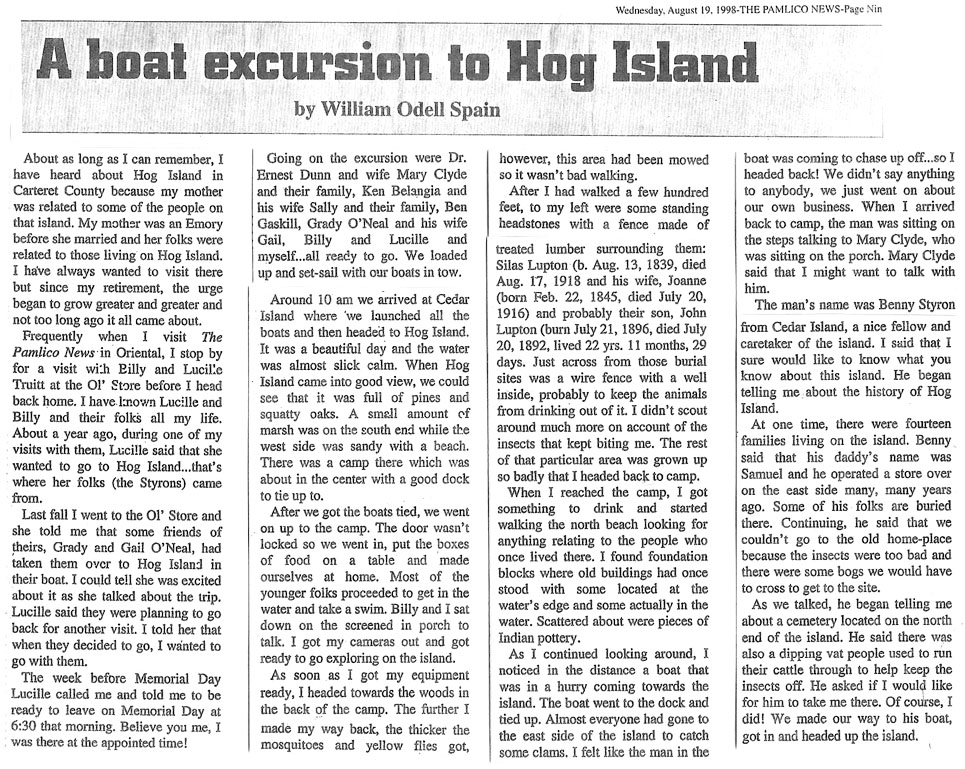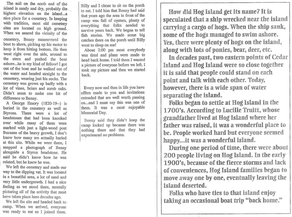 This article, written by William Odell Spain, appeared in The Pamlico News on Wednesday, August 19, 1998 along with the photographs. The news article was too large to scan in its entirety so it had to be scanned in two pieces. Read the top image first and then the second image. Hog Island once had people living on it but, according to Ellen Cloud, noted researcher of Carteret County, the North or west island and the south or east island used to be one long island. The small strip of land connecting the two was washed away during the 1944 hurricane, making 2 islands. Shortly after this occurred, people living on the north or west island moved to the south or east island because that was where the store, school, post office and fish houses were. When the school closed and mail boats no longer stopped there, the people moved to the mainland, most went to Cedar Island.