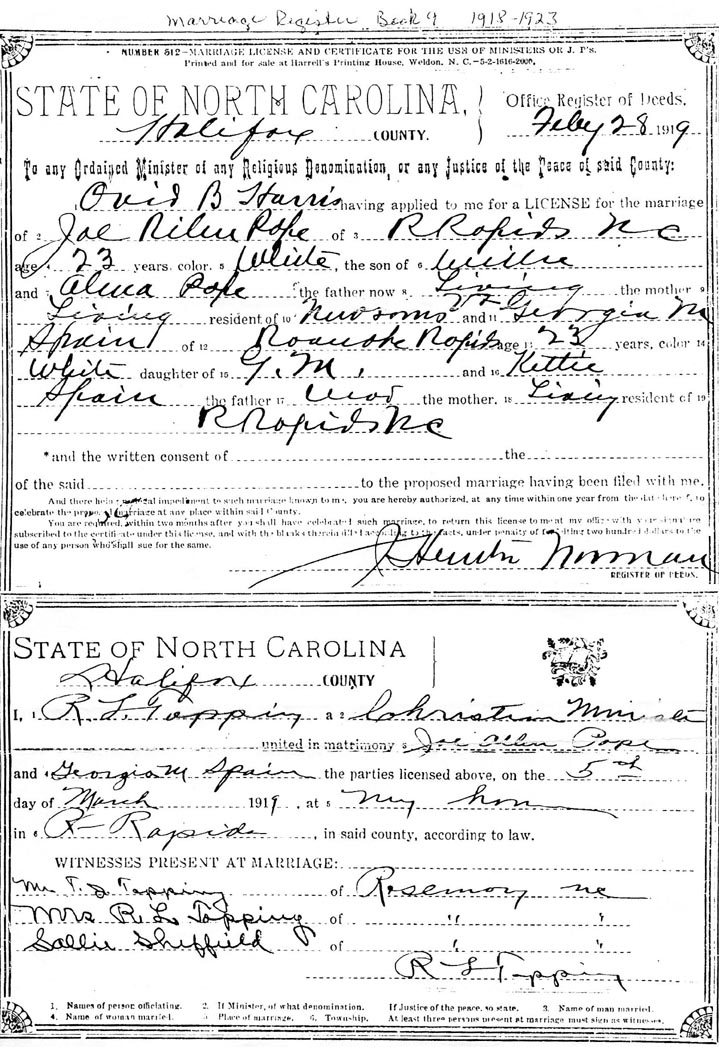 Halifax County.I, R. L. Topping, a Christian Minister, united in matrimony Joe Allen Pope and Georgia M. Spain the parties licensed above, on the 5 day of March 1919, at my home, in Roanoke Rapids, in said County, according to law.