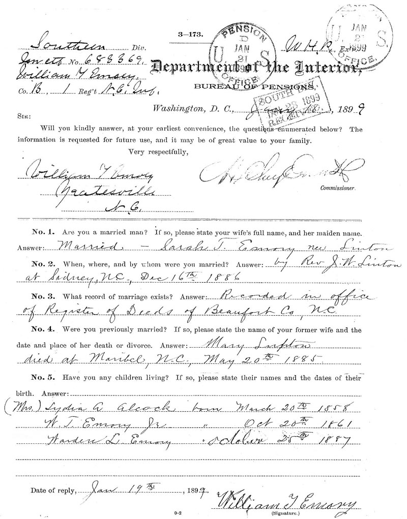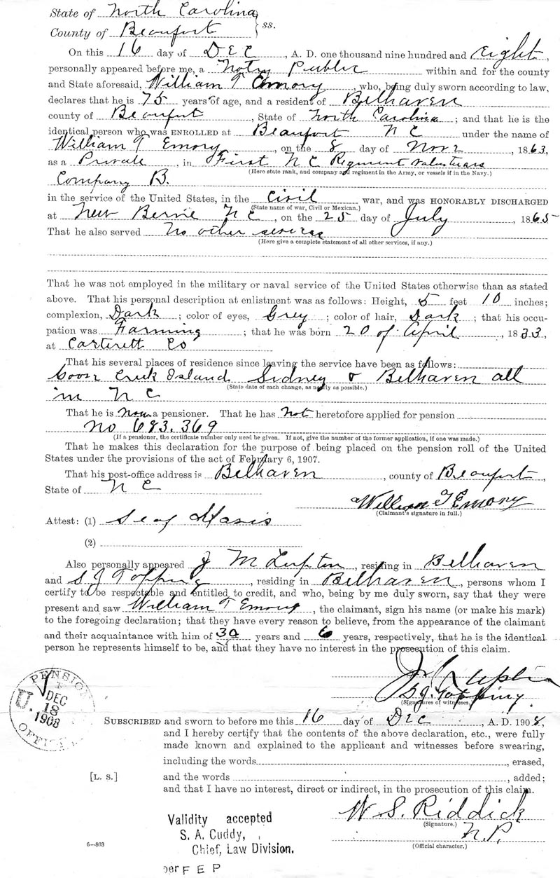 Also personally appeared J. M. Lupton, residing in Belhaven and S. J. Topping, residing in Belhaven, persons whom I certify to be respectable and entitled to credit, and who, being by me duly sworn, say that they were present and saw William T. Emory, the claimant, sign his name (or make his mark) to the foregoing declaration; that they have every reason to believe, from the appearance of the claimant and their acquaintance with him of 30 years and 6 years, respectively, that he is the identical person he represents himself to be, and that they have no interest in the prosecution of this claim.