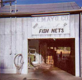 In 1939, R. E. Mayo moved his business from Bayboro to the north side of the Hobucken Bridge in Hobucken. Roland Styron (1888-1979) also owned and operated a fish house in 1939 for several years beside the Mayo business. They purchased seafood from local fishermen for transport to other areas. Also in 1939 boats from Core Sound and Ocracoke brought the first shrimp to Hobucken. The shrimp had been caught in Bay River. In 1950, R. E. Mayo moved his business to the south side of the Hobucken Bridge. |