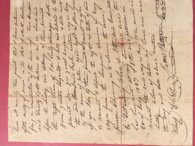 Whare of I set my hand and seal the day and date above written. JAMES PATTERSON {Seal} Witness J. A. GIBSON |