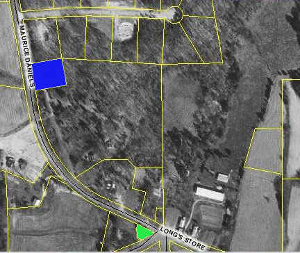 Location: Maurice Daniels Road. Directions: Semora Road to Long's Store Road. Left on Long's Store Road to Maurice Daniels Road. Cemetery is on right. In the graphic below, Long's Store is green; Flem Long Cemetery is blue. GPS Coordinates: 36° 25' 00"N, 79° 04' 49"W (WGS84/NAD83) Topographic Map