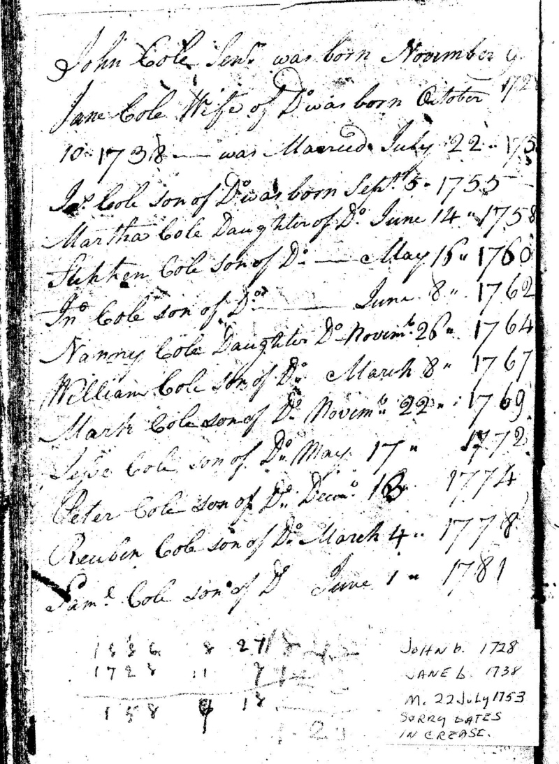Jane Cole wife of 'Do' was born October 10 1738 - was married July 22 1753