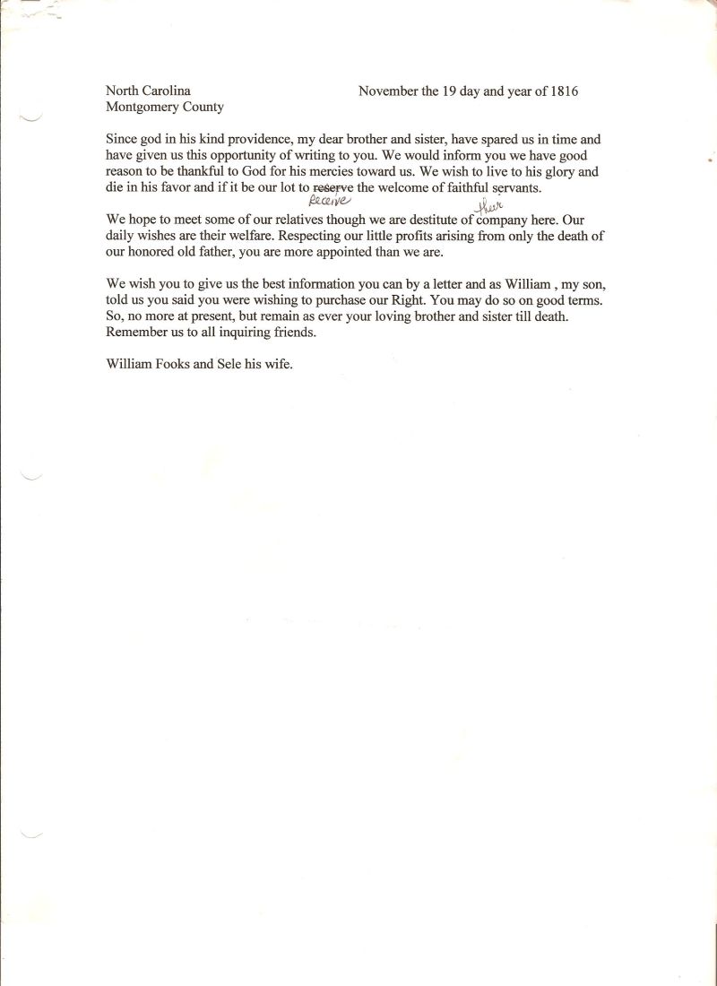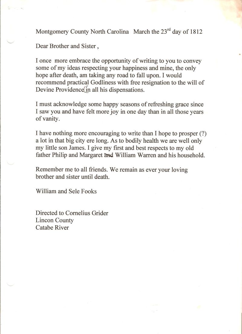 Translation of 1816 Letter from William Fooks to Cornelius Grider |