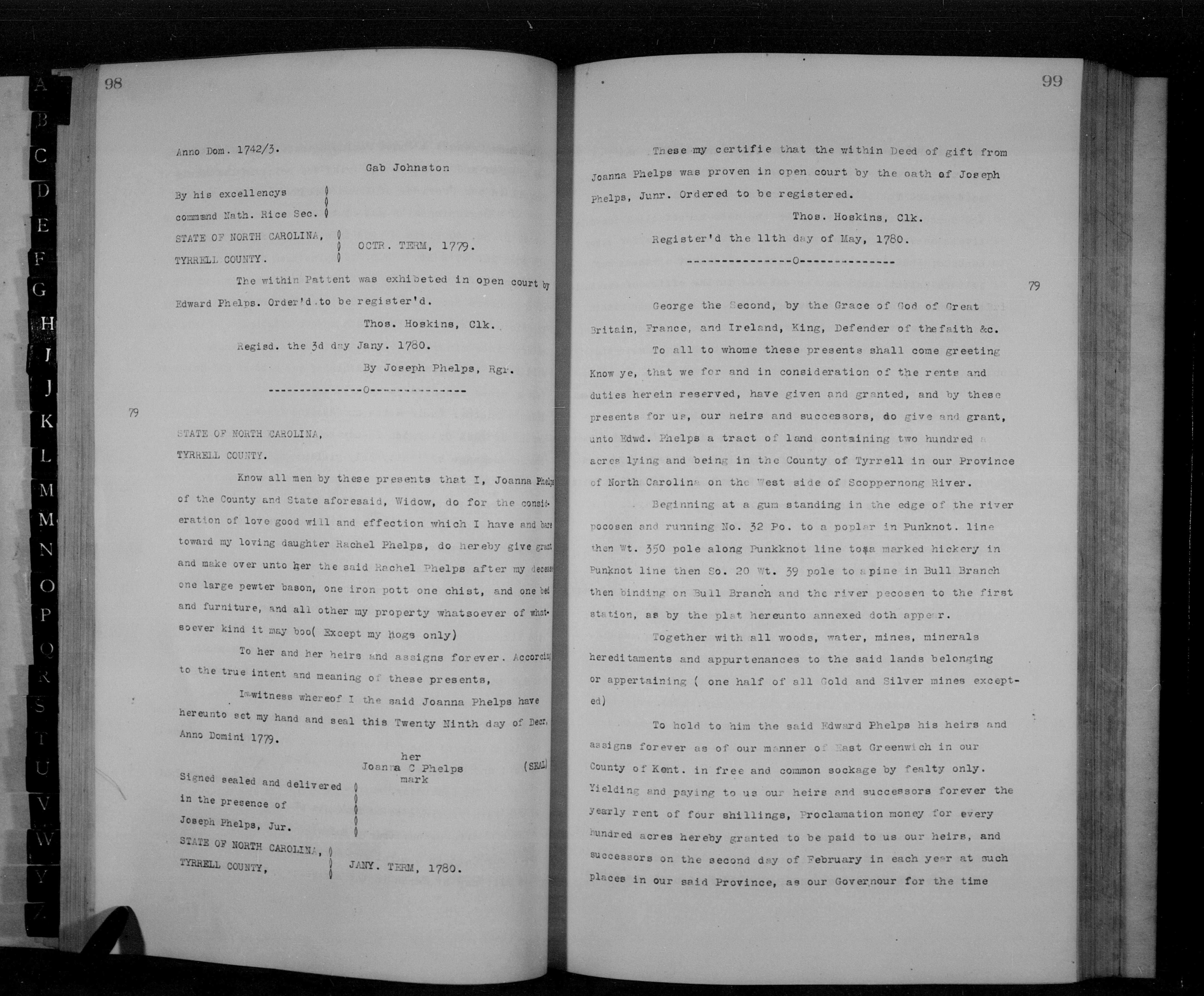 | Rushel, John | Deed of Gift | 1764 | Tyrrell County Deed Book 4, Part 2, page 40 | Charles W. Barnes