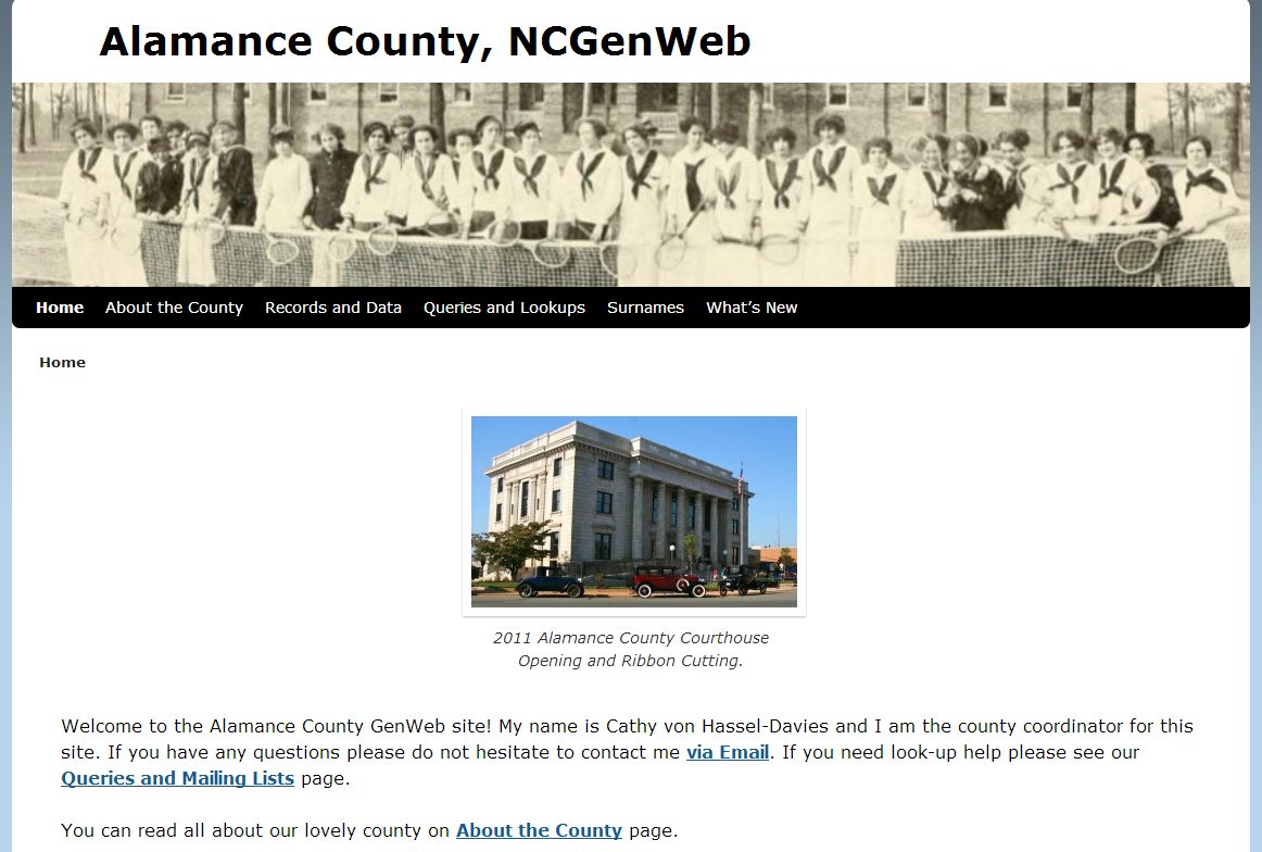 Alamance County is coordinated by Cathy von Hassel-Davies. Cathy joined the NCGenWeb in December and is enthusiastic about helping researchers get to information relevant to the county. If you would like to stay current with site updates, be sure to subscribe to the RSS feed or sign up to receive notifications by email. A big welcome to Cathy!