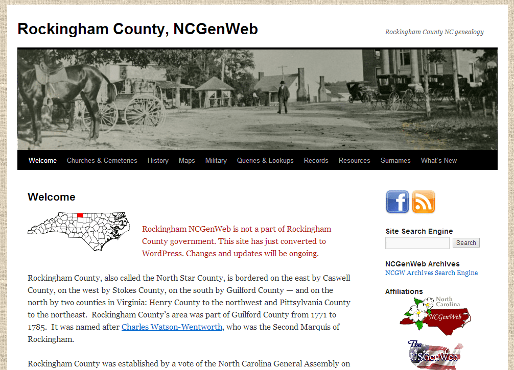 Additionally, the Rockingham County site has also had a facelift. Interim coordinator Katherine Benbow is an experienced genealogist and has been with NCGenWeb for many years. Katherine can help steer you in the right direction should you have questions about researching genealogical information in that area. Subscribe to the RSS feed to stay current with updates.