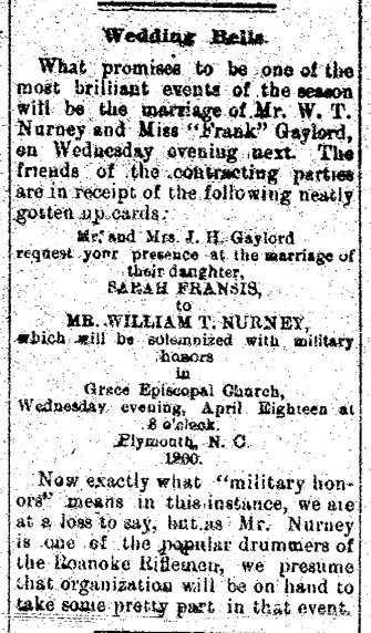 Marriage: NURNEY, William T. and Sarah F. GAYLORD (1900) Posted on May 29, 2012 by The following announcement appeared in the April 13, 1900 issue of the Roanoke Beacon newspaper at the bequest of Mr. and Mrs. J. H. GAYLORD.