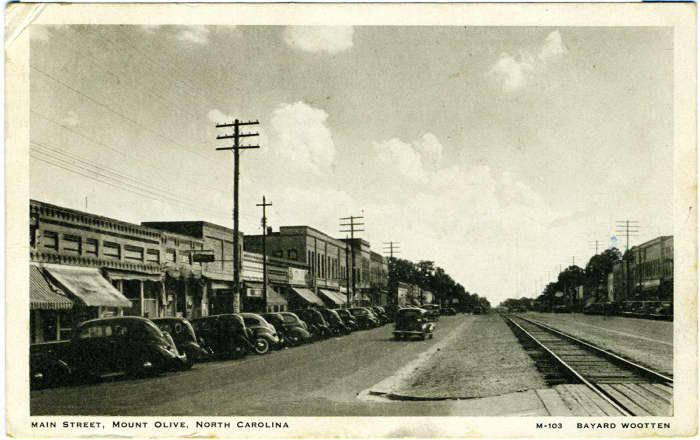 Title Main Street, Mount Olive, North Carolina Mount Olive Tribune September 7, 1979 Volume 76 – Number 44 – Section B By John Baxton Flowers III During the Civil War, Mount Olive was but a small railway station on the historic Wilmington and Weldon Railroad (now Seaboard Coast Line). The railroad movement in North Carolina was first stressed in 1827 when President Joseph Caldwell of the University of North Carolina wrote a series of newspaper articles, which were published in 1828 as a book, “The Numbers of Carlton,” in which he discussed the superiority of railroads over canals and turnpikes, and advocated the state government take the lead in building railroads. The Experimental Railroad in Raleigh was built by private capital in 1832-1833 to move stone from the quarry to Union Square where the present capital building was then being erected. The railroad, only one and a quarter miles in length, convinced many influential people that rail travel would help get North Carolina out of her economic depression. The Wilmington and Raleigh Railroad Company was chartered in 1834 with a million and a half dollars in capital, and was largely a Wilmington enterprise. The destination at Raleigh was soon changed to Weldon, and the name changed to the Wilmington and Weldon Railroad Company. Governor Edward B. Dudley of Wilmington was president of the company, and the small but progressive station depot that was established on February 3, 1860 five miles north of present-day Mount Olive was named in his honor. The U.S. Post Office Department established a post office at Dudley on January 13, 1840, with John W.S. West as postmaster. This first Dudley was located on the east side of the railroad just south of where Everettsville was located, and is said to have taken its name from Dudley Lewis, a prominent local figure. Soon after it was established this post office was renamed Everettsville, which continued until December 6, 1866 when it was closed. Later the second and present Dudley was established, and named for Gov. Dudley. Dudley – Everettsville The Dudley station served the little village of Everettsville, which was six miles south of Goldsboro, and four miles north of present-day Dudley, as well as the rich plantations southwest of Goldsboro. Everettsville boasted two churches, a good school, a Masonic lodge, and more than a dozen homes belonging to some of the wealthiest citizens of Wayne County. It was said to be the most aristocratic community in the county until it broke up after the Civil War. The town was established by wealthy planters to escape the low marshy ground that bordered the river and many creeks and swamps around it. There were great losses to floods, malaria and typhoid fever, and doctors had urged residents to seek higher ground. The Everett lands were higher, more arid and the soil was sandy, and so the Everetts established a small town on their land and it took the name of Everettsville. The names of the village of Everettsville’s families read like an early history of the county, with the Everett, McKinne, Becton, Collier, Carraway, Slocumb, West, Hollowell and Hooks families among the most prominent. Most of the other prominent county families were related to these, and there has remained a great respect for the village though it disappeared over a century ago. In 1863, David McKinne, a descendant of the famous old Colonel William McKinne, of Wayne County, was station agent at Dudley, with a salary of $180.00 annually. When this salary is contrasted to the $120.00 earned by the agent at Mount Olive Station you get the idea that Dudley was economically more important in 1863. Railroad Purchases Right-Of-Way On March 25, 1835, the Wilmington and Weldon Railroad Company purchased a right-of-way through Wayne County. The owners of the land were paid one dollar for their consent. The only two men listed in the action of 1835 who lived in the Mount Olive area were Samuel Flowers and Ezekiel Slocumb. Samuel Flowers lived on an extensive plantation called “Poplar Hill”, on Thunder Swamp. He was a veteran of the War of 1812 and a magistrate. Ezekiel Slocumb was a soldier in the Revolution, and lived with his wife, Mary Hooks Slocumb on a large plantation northeast of Mount Olive. Mary Hooks Slocumb was a sister of Charles Hooks, and mother of Jesse Slocumb, both of whom served in the United States Congress from North Carolina. The deed to the right-of-way makes it clear that those subscribing felt that the railroad would enrich the area economically. The fact that they deeded their land for a token re-enforces this. On March 20, 1838 the county records show that in consideration of the sum of $19.00, Adam Winn deeded the railroad a right-of-way through his lands. In November, 1837 and again in February of 1838 the President and Directors of the railroad had appealed to the Wayne County Court of Pleas and Quarter Sessions to force Winn to sell them a right-of-way. At that point the railroad was getting near the county line. Winn sold in 1838. It is believed that Winn’s land lies along present day Center Street. The 1838 deed to the railroad stated that the adjoining lands to the north belonged to Basil Kornegay, a rich Duplin County planter, member of the state House of Commons in 1814, and brother-in-law of William Rufus King, Vice- President under Franklin Pearce. The adjoining land of Winn’s was owned by Charles Winn, who was a member of his family. With Winn’s lands on the south, and Flowers’ and Slocumb’s on the north, the railroad had a clear right-of-way to Dudley. The railroad track begins at Wilmington, curves at Faison, and then runs in an almost direct line to Weldon. When it was finished in 1840, with 161 miles of track, it was the longest railroad in the world. Mount Olive Granted a Post Office On July 1, 1853 the village of Mount Olive was granted a post office. Dr. Gideon Monroe Roberts was appointed first postmaster. The village was just 